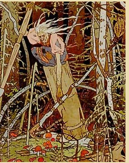 Da stieg Baba-Jaga in ihre fliegende Reibschale und nahm die Verfolgung auf. Mit dem Stößel beschleunigte sie, mit dem Besen verbarg sie ihre Spur.