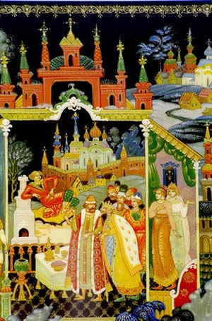 Und so geschah es. Jemelja und Marja-Zarewna kamen aus dem Fass heraus. „Auf Hechtes Geheiß, nach meinem Willen sei’s, soll hier ein prächtiges Schloss stehen.“ Das Schloss tauchte sofort wie aus dem Nichts auf.