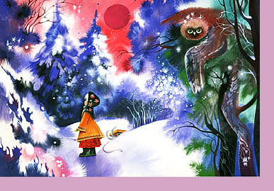 Eines Tages im Winter fuhr der alte Mann in die Stadt auf den Markt. Die alte Frau rief das Mädchen herbei und befahl ihr, in den Wald zu gehen und Holz zusammenzutragen. Das Mädchen musste sich auf den Weg zu machen.