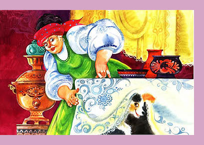 Die alte Frau buk währenddessen zu Hause Bliny und wartete auf die Tochter mit den Geschenken. Und der Hund saß unter dem Tisch und bellte: „ Wuff, Wuff, die Tochter des Alten wird bald heiraten und die Tochter der Alten kommt nicht aus dem Wald zurück!“ Da regte sich die alte Frau auf: „Und was, wenn sie die reichen Geschenke unterwegs verliert?“ Sie zog sich einen Mantel und einen Schal an und beeilte sich zu ihrer Tochter.