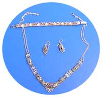Bestehend aus: Armband (16 cm), Ohrringe und Halskette (45cm). Email auf versilbertem Metall. Handarbeit.