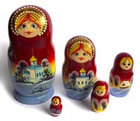 russischen Wintermotiven. Die Kopfbedeckung der Matroschka (im Russischen Kokoschnik genannt) ist mit einer speziellen Technik gefertigt,