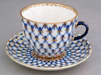 Bestehend aus: einer Tasse (140 ml)und einer Untertasse (Durchmesser 11,00 cm).Die Verzierung heisst Kobaltnetz und wird in Russland hoch geschätzte.