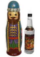 Bestehend aus: einem Flaschenhalter (Holz, handbemalt, Höhe 32cm) und einer Flasche Vodka Altes Russland, (Inhalt: 0,5l, Alkoholgehalt: 40%). Der Falschenhalter dient gleichzeitig als Tischdekoration und als Isoliergefäß für seinen Inhalt.