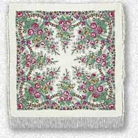 Größe: 125cm x 125cm, der Hintergrund ist weiß, 100% Wolle, mit Seidequasten, Hersteller: Pawlower Schalmanufaktur. Autorin: Irina Dadonowa.