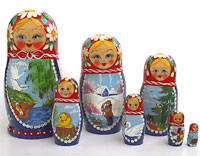 Die kleinste Matroschka ist etwa 2cm groß. Auf den Puppen sind Szenen aus den Märchen: Gusi-Lebedi, Auf Hechtes Geheiß, Der Rabe und der Fuchs und
