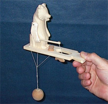 Der Bär betätigt bei der Bewegung des Holzballs die Angel und zieht damit den Fisch. Das Spielzeug ist in der traditionellen Technik der Bogorodskoje-Schnitzerei gefertigt. Maße: H 12,6cm, Grundfläche: 16,5cm x 5cm. Grundstoff: Linde.