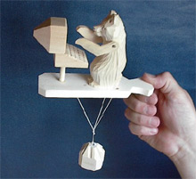 Der Informatiker-Bär betätigt bei der Bewegung des Holzballs die Tastatur des Computers. Das Spielzeug ist in der traditionellen Technik der Bogorodskoje-Schnitzerei gefertigt. Maße: H 11cm, Grundfläche: 15cm x 4,5cm. Grundstoff: Linde.