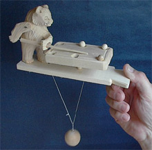 Der Bär verschiebt bei der Bewegung des Holzballs den Qeue und schlägt damit auf die Kugeln. Das Spielzeug ist in der traditionellen Technik der Bogorodskoje-Schnitzerei gefertigt. Maße: H 11,5cm, Grundfläche: 19,5cm x 5cm. Grundstoff: Lind