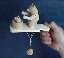 Die Bärin wäscht bei der Bewegung des Holzballs ihr Kind. Das Spielzeug ist in der traditionellen Technik der Bogorodskoje-Schnitzerei gefertigt. Maße: H 9,5cm, Grundfläche: 14,5cm x 5cm. Grundstoff: Linde.