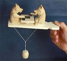 Bei der Bewegung des Holzballs spielen die Bären Domino. Das Spielzeug ist in der traditionellen Technik der Bogorodskoje-Schnitzerei gefertigt. Maße: H 9cm, Grundfläche: 19,5cm x 5,25cm. Grundstoff: Linde
