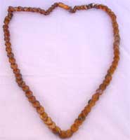 Gesamtlänge: 64 cm. Größe der Einzelsteine: ca. 1,5 cm. Zusammengestellt aus Bernsteinen, die in die Form eines Baumblattes geschliffen sind.