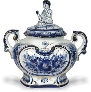 24 cm x 21 cm, mit Gold. Die Gschel-Meister bemalen alle Produkte ausschließlich von Hand. Gschel hat einen ganz eigenen Stil - blaue und hellblaue Verzierungen und Blumen auf weißem Hintergrund. Die Bemalung wird mit Kobalt durchgeführt, das während des technologischen Prozesses die für Gschel charakteristische blaue Farbe annimmt. Mehr darüber finden Sie auf der Hauptseite.