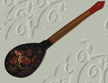 Holz, Länge: 19 cm. Wurde im Stil "Hochloma" mit den Farben schwarz, rot, grün und gold, was für diesen Stil ganz typisch ist, bemalt. Solches Geschirr ist in Russland traditionell und ist ein beliebtes Souvenir. Hersteller: AG "Hochlomskaj