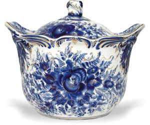 Die Gschel-Meister bemalen alle Produkte ausschließlich von Hand. Gschel hat einen ganz eigenen Stil - blaue und hellblaue Verzierungen und Blumen auf weißem Hintergrund. Die Bemalung wird mit Kobalt durchgeführt, das während des technologischen Prozesses die für Gschel charakteristische blaue Farbe annimmt. Mehr darüber finden Sie auf der Hauptseite.