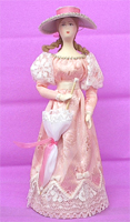 Höhe: 26 cm. Materialien: Porzellan, Pappe, Baumwolle, Zamt, Kunststickerei.