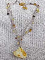 Der Anhänger ist ein schönes poliertes Bernsteinstück. Die kleinen Bernsteinperlen sind auf leinenen Fäden befestigt,Bernsteinverschluss, Farbe: weiß-gelb, Länge der Kette: 600 mm, Maße des Anhängers: 45 x 40 x 10 mm.