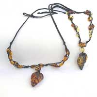 Der Anhänger ist als Muschel geschliffen. Er ist auf einer geflochtenen Kette befestigt. Der Knopfverschluss ist aus Bernstein. Farbe: Anhänger - dunkel-braun, durchsichtig; Bernsteinperlen: hell-gelb und dunkel-braun.