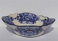 Länge: 20cm, Breite: 16 cm, Höhe 7 cm. Ein traditioneller russischer Teller für Salate; handbemalt im Gschel-Stil.
